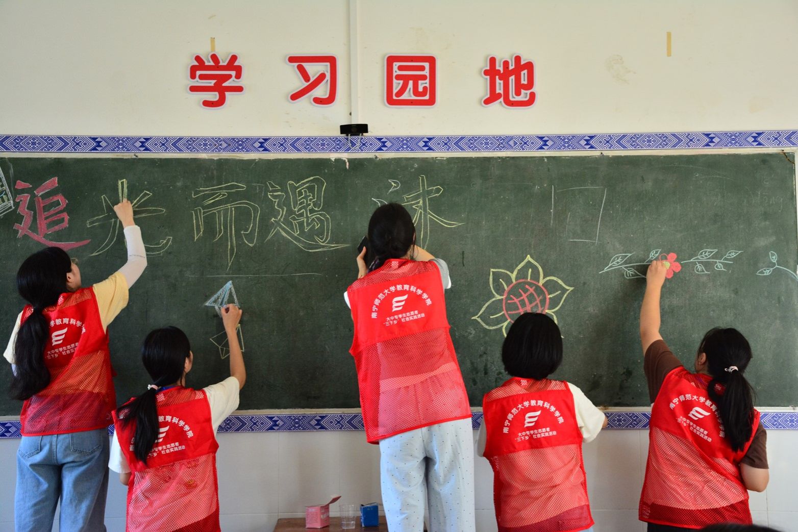 下午,支教组成员们开展了板报绘制工作,对两个班级的黑板进行创作,运用色彩与图案,勾勒出一幅幅充满希望的画面,不仅美化了教室环境,更激发了学生们的学习热情。