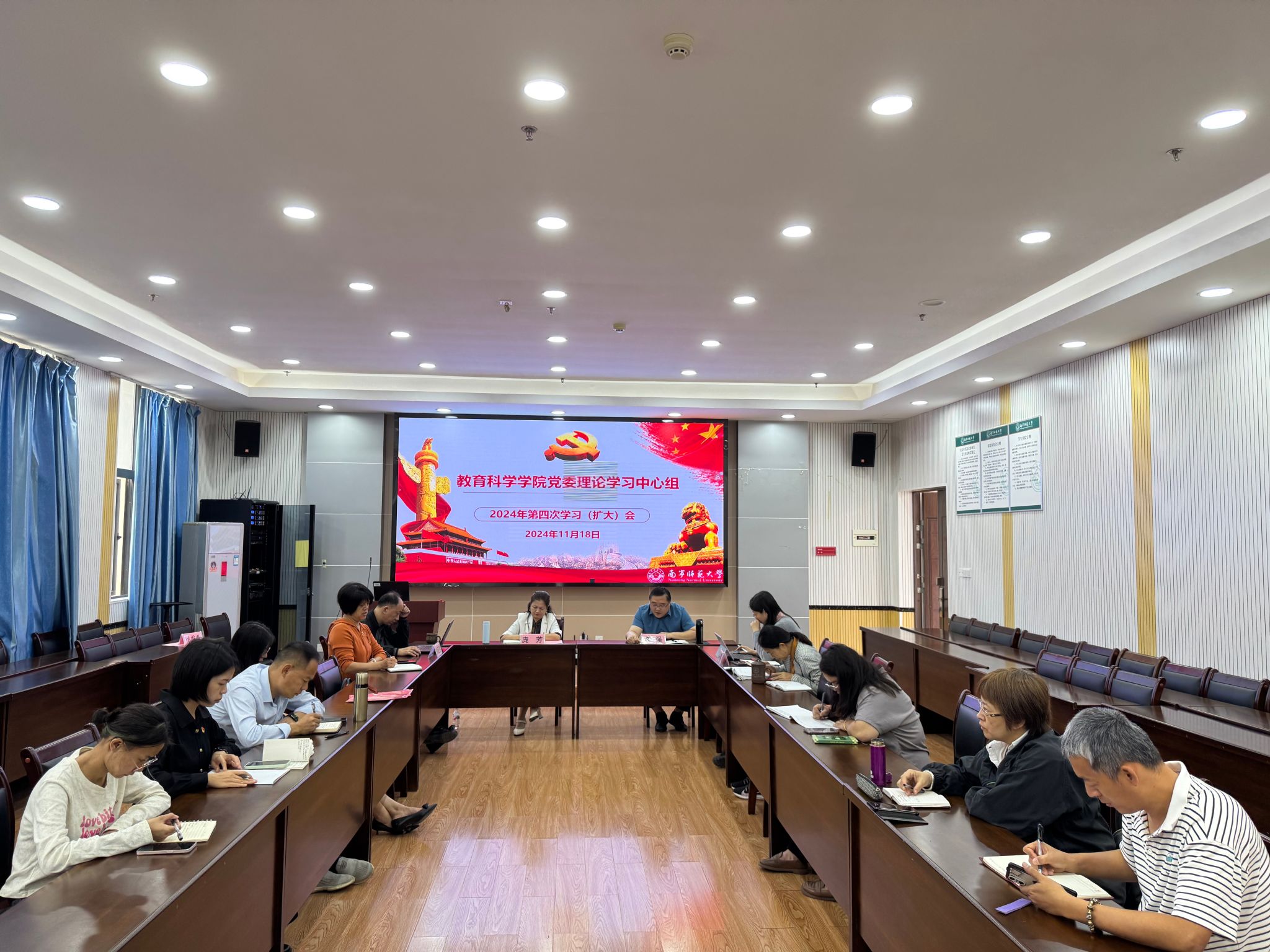 11月18日上午,教育科学学院在五合校区理楼1003会议室召开党委理论学习中心组2024年第四次学习(扩大)会议。会议由学院党委书记庞芳主持,党委理论学习中心组成员、纪委委员及各党支部书记参加会议。