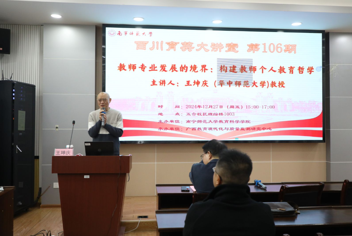 为大力弘扬教育家精神,助力师生拓展学术视野,12月27日下午,由教育科学学院基地、广西教育现代化与质量监测研究中心主办的百川育英大讲堂系列第106期讲座,于我校五合校区理综楼1003室举行。此次讲座特邀华中师范大学王坤庆教授以“教师专业发展的境界:构建教师个人教育哲学”为主题,由教育科学学院朱家安教授主持。