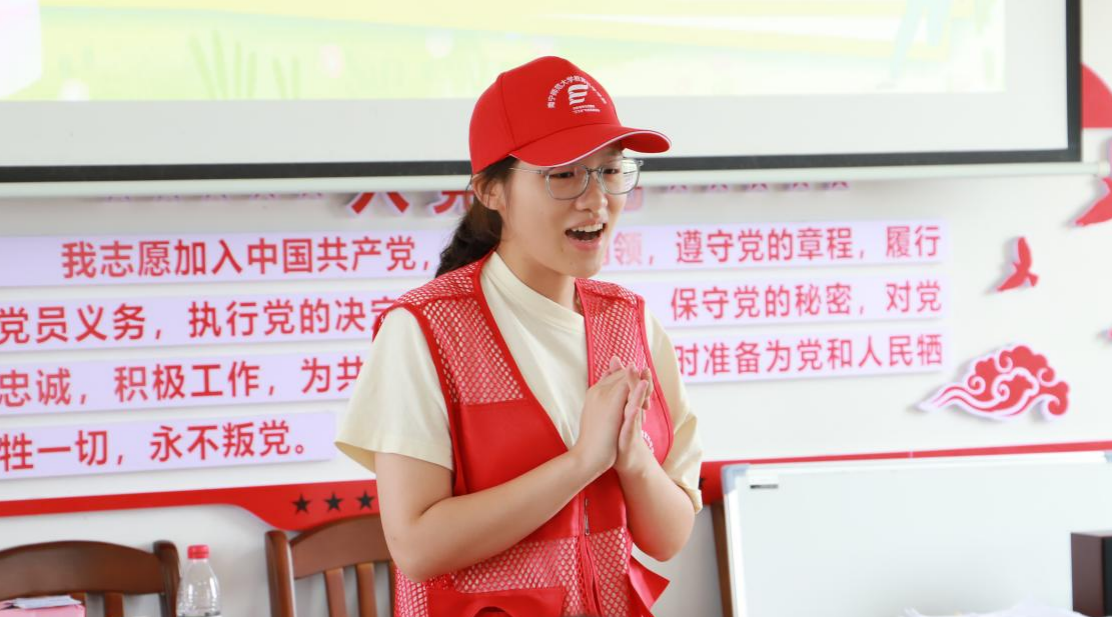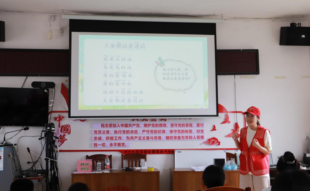 “四和十,十和四……”清脆的绕口令声从教室飞出。趣味朗读会上,通过挑战趣味绕口令和练习 “老师早上好”“谢谢”“再见” 等日常礼貌用语,提升了学生们普通话的流畅度,帮助他们培养规范表达习惯。实践队员对发音不标准的学生给予鼓励,用形象比喻帮助学生降低发音难度,提高普通话的发音准确性。还通过断句小游戏锻炼学生对普通话语言结构的理解能力,引导学生“先拼意思再连成句”掌握基本断句规则,培养普通话语感。每年九月第三周是全国推广普通话宣传周,实践队员向学生们介绍推普周的时间、起源及社会意义,深入讲解讲好普通话的重要性。鼓励学生从日常小事做起,在交流中主动使用普通话,感受自身在推普中的价值,树立推广普通话助力乡村振兴的责任感。