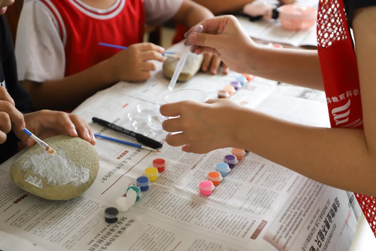 在同学们熟悉基本技巧后,志愿者老师们再将鹅卵石、五颜六色的颜料、粗细不一的画笔等材料有序分发给每位同学。分发过程中,老师耐心询问大家的创作想法,并结合石头的形状、纹理给出进一步建议,为接下来的绘画环节做好充分铺垫。