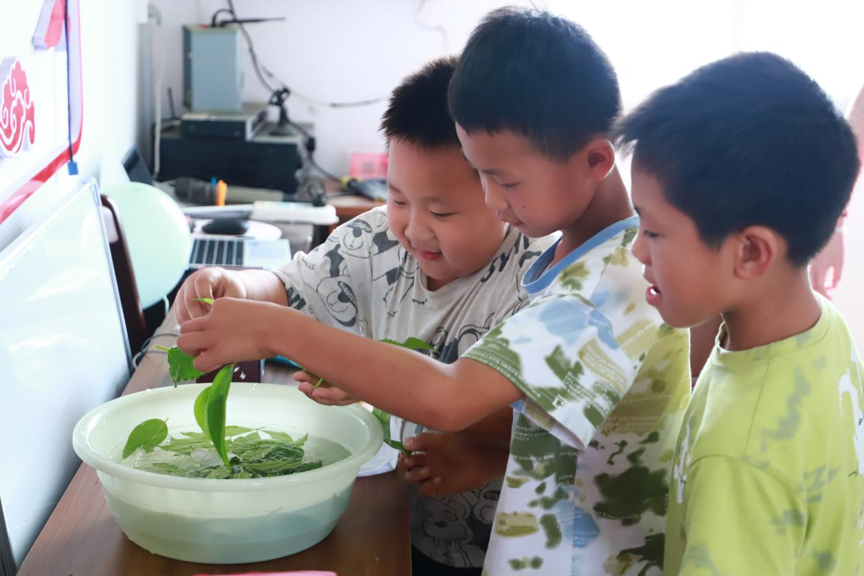 开课前,志愿者老师们踏着清晨的露水在村委附近采摘10余种叶片,清洗后放入水盆中保鲜,完成“田野备课”。上午8时许,陆续有学生来到天宝村村委,开启第一天的夏令营活动。老师以视频短片《植物拓染》导入,用3分钟展示如何通过锤草技艺制作印花服饰。随后,老师向大家介绍锤草印花的具体制作步骤和技巧,如花草的摆放、锤子使用方法和胶带如何固定植物等。孩子们瞪大眼睛,跃跃欲试。